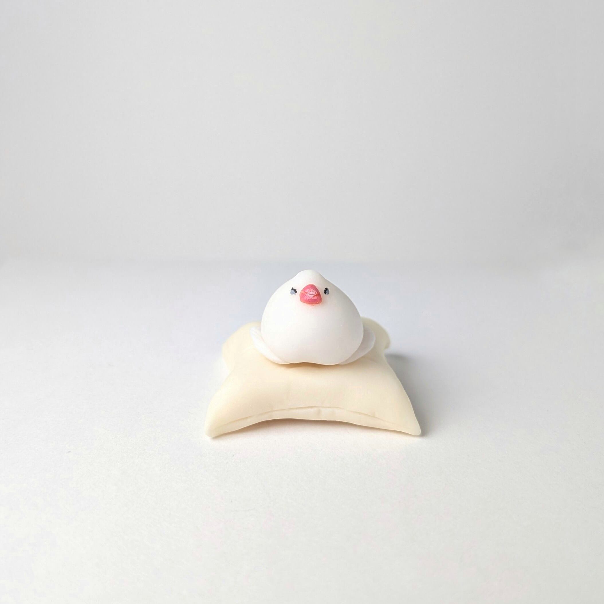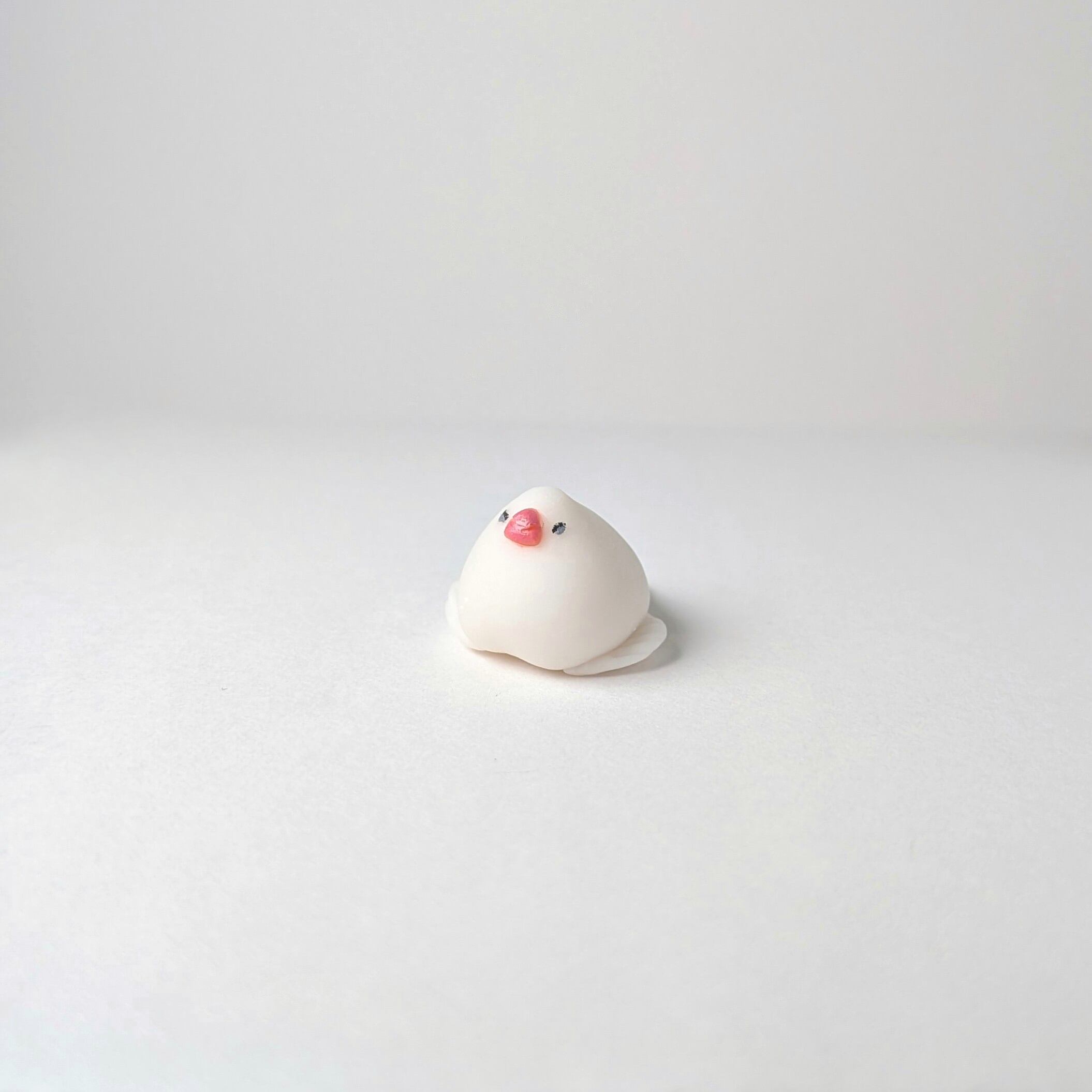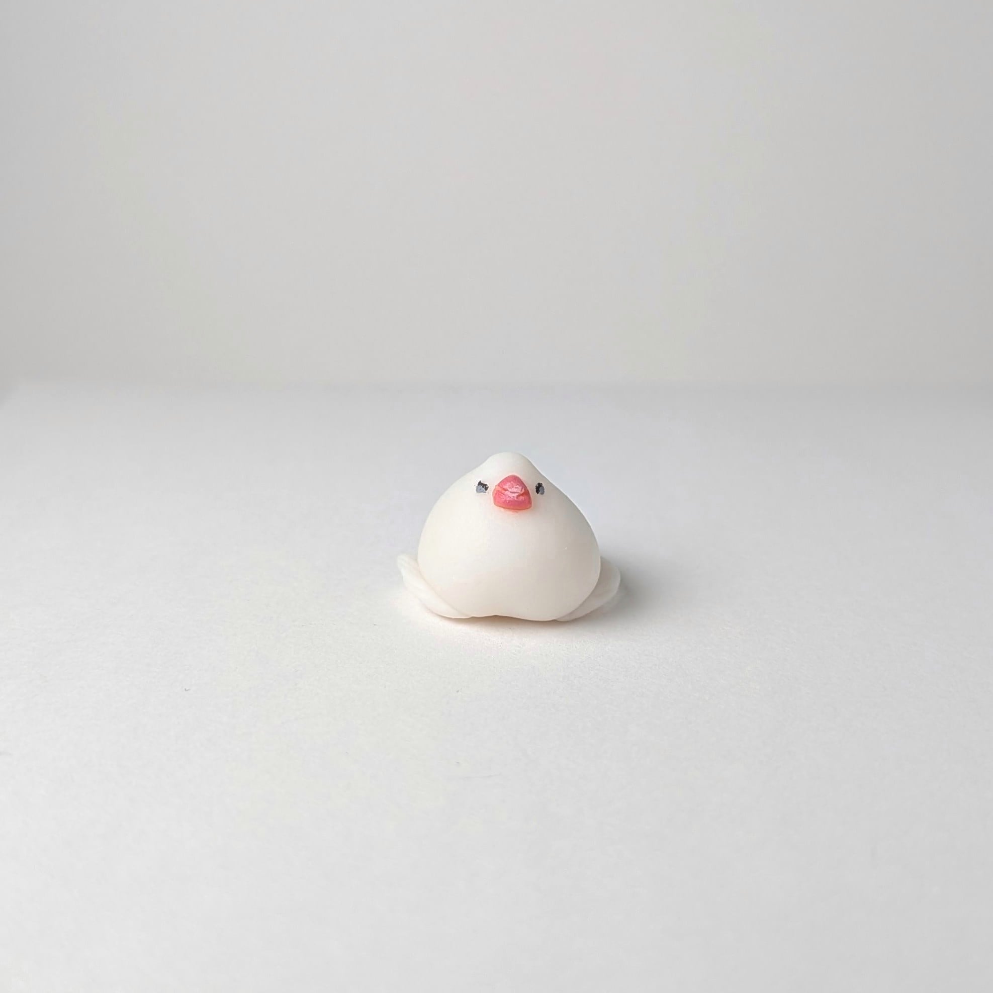 A tiny Java Sparrow figurine that fits right on your fingertip. Every detail has been carefully sculpted, capturing its relaxed gaze, the soft mochi-like form, and even the "engawa" spilling out. Perfect for your desk, a small shelf, or as a thoughtful gift for bird lovers.